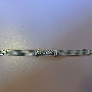 This is a NWT charm from Keep Collective / Stella & Dot in silver with the word "breathe". 1-1/4" in length. Comes with a silver mesh bracelet and the charm can be exchanged with other mesh and leather bands from Keep Collective. Bracelet is 7-1/2" long.