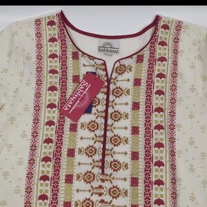 Cream with red beige prints Size Large Flat measurements; Pit to pit 21" Length 39.5" 088
