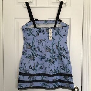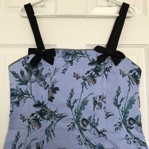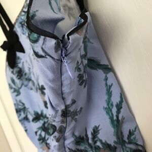 Square neckline, size zip closure, tiered illusion black hem lines, angels/floral/flowers pattern design, bow applique detailing on straps.