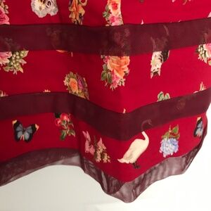 Square neckline, size zip closure, tiered illusion black hem lines, cat/duck/swan/bird/fan/sunflower/floral pattern design, bow applique detailing on straps.