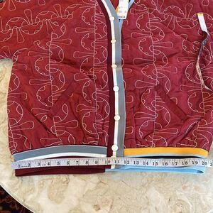 Loose fit with a v-neckline and snap front trimmed with striped ribbed knit.