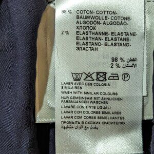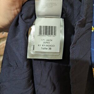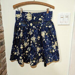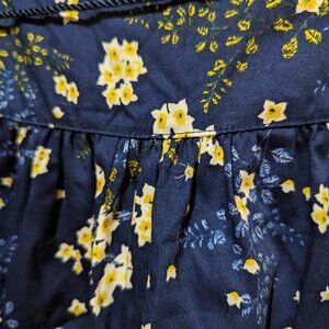 This beautiful floral skirt was bought in France 5 years ago but has never been worn. Deep indigo blue with yellow and white flowers. The belt has some shiny metallic thread mixed with the regular blue threads.