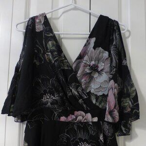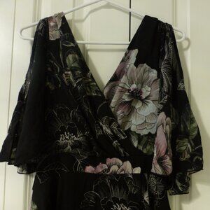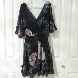 NWT! Black with floral print, floral flutter sleeves, v-neckline, goes above the knee, lightweight, chiffon material.