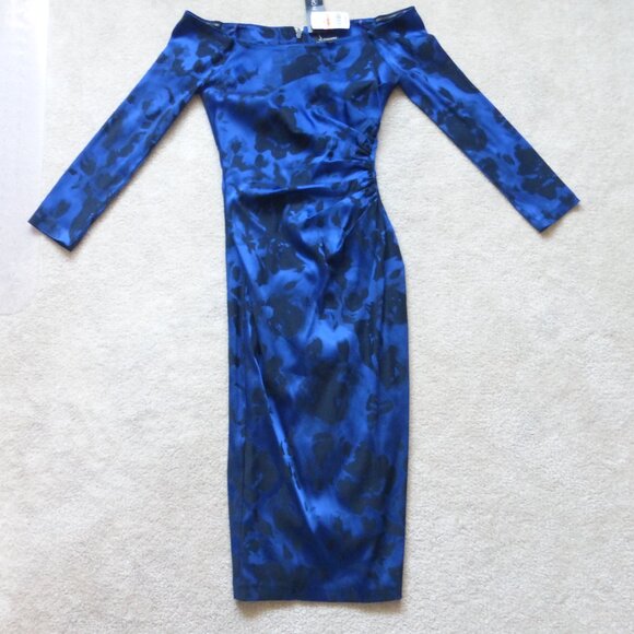 NWT! Gorgeous cobalt blue colour with all over abstract print. Long sleeves, zips up in the back, cinched on one side, off shoulder with silicone lining. Great dress for your next party, semi-formal event, cocktail party, wedding or night out!