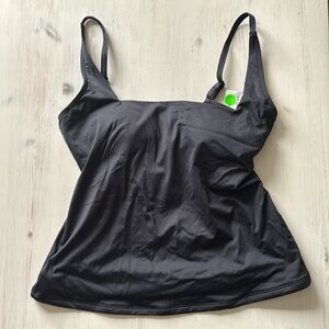 DESCRIPTION: This flattering squareneck tankini top offers non-stop water sports support and all-day comfort both in and out of the water. Adjustable straps. Falls at high hip. Shelf bra with removable padded cups. Deep back cutout with crossover strap design.