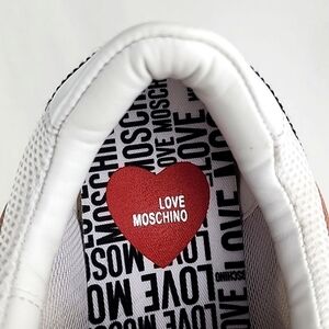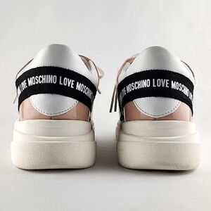 New with tags, Love Moschino women’s sneakers trainers in a white & salmon leather and mesh upper and signature logo-tape, size 40.