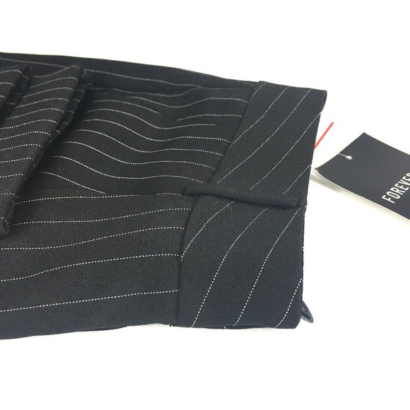 New with Tags Ladies Forever 21 black formal pants with white pinstripes. Pleated Button Up Front with belt loops, double back pocket and leg turn-ups. 94% Polyester 5% Spandex/Elastane 1% Rayon.