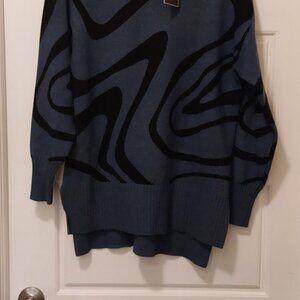 NWT Ladies sweater - Soft long sweater, tunic style, great with leggings, denims. Blue grey colour with some black contrasts. This is a size small, however it fits more of a medium. Top is intentional lower in the back to the front with 4-5 inch side slits on bottom