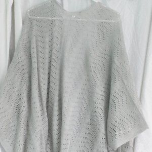 This knit kimono is perfect to throw on over a t shirt in any season. It's lightweight and flowy. It's a beautiful silvery-blue color with lots of detailing in the knit. It's very soft and comfortable.