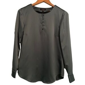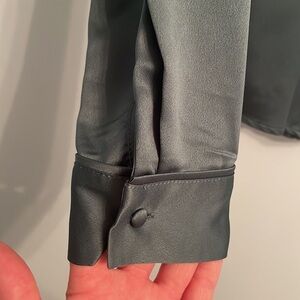 NWT Beautiful Pine green colour satin-feel and look long sleeve blouse. Gorgeous button details (5) down the front and one on each wrist. Darts on the bust for a flattering fit. Pleating details on shoulders.