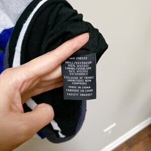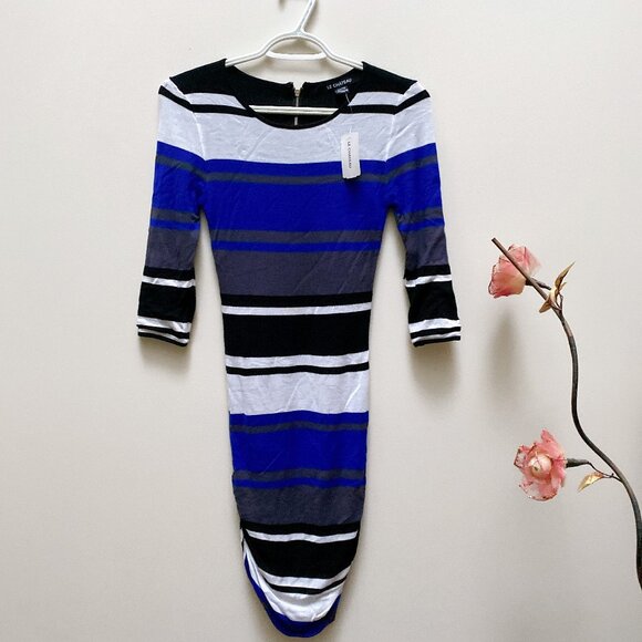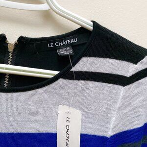 NWT Le Chateau Blue Black Striped 3/4 Sleeve Rib Knit Midi Bodycon Dress