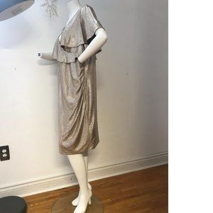 MADE IN CANADA, Hard to find old stock LeChateau NWT Stunning and flattering shiny gold shimmer metallic faux wrap bodycon dress, side drape, ruffle V-neck, V-back.
