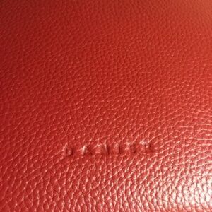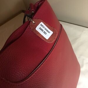 New leather Crossbody with adjustable strap, back zippered pocket, front slip pocket with magnetic clasp. Top zippered. Inside zippered pocket and large slip pocket. Beautiful shade of dark red. New dust bag incl. 10H x 9W x 3D