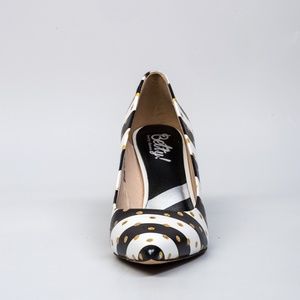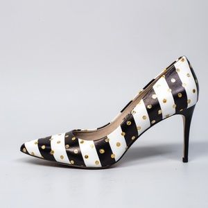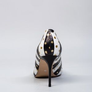 This is a genuine printed leather pointed toe high heel with large black and white stripes patterned with gold glitter polka dot. The plain glossy black heel is approximately 3’’ high.