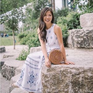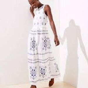 NWT Loft wavy embroidered medallion white navy maxi dress Sz S