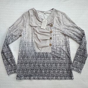 NWT - A long-sleeved shirt with a unique batik-print style design in a soft lightweight jersey fabric with an asymmetrical drape collar.