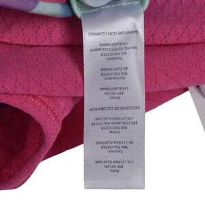Pink colored tank with multi color underneath - double layer cool fabric with mesh for breathability and four way stretch - Racerback - coolmax - band bottom keeps tank in place - insert areas for bra pads - great for school, gym, play.