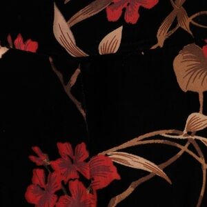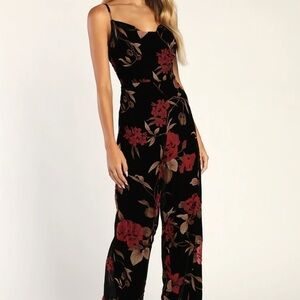 Elegant black jumpsuit with striking red floral patterns. Perfect for any occasion.
