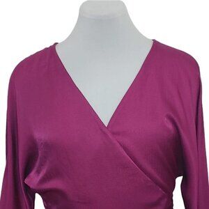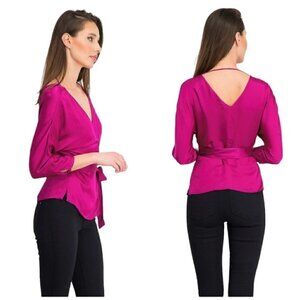 NWT MANGO Purple/fuschia color, textured satin fabric, true wrap, batwing cropped sleeves, blouse, size small. Nice light and soft fabric, no stretch to it.