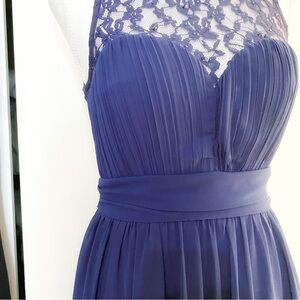 MANIJU NAVY CHIFFON SLEEVELESS LACE BEADED PLEATED SWEETHEART EMPIRE WAIST EVENING FORMAL GOWN , A sleek flowy navy chiffon full length evening gown - sleeveless with a navy sheer beaded lace upper bodice - pleated sweetheart bust style - empire waistline fully lined - not stretch. Perfect for formal overdressed glamorous evening occasions like red carpet or prom.