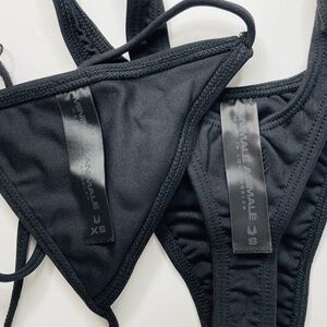 “Dark Seas" (black). XS top new with tag. S bottom new with tag but no hygiene liner sticker. Models may not be wearing the same size. Colors indicated or photographed may appear different in real life. Item condition and packaging proces recorded. Shipped in repurposed packaging. May wrinkle in transit. Measurements / fit pictured are approximate, not exact, and can vary due to stretch, wear, or other factors.