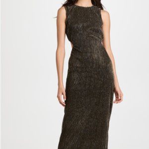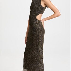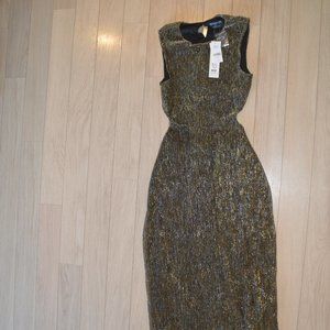 The perfect party dress! High neckline with a bra-friendly back cut out. The dress is fully lined with a gold metallic overlay.