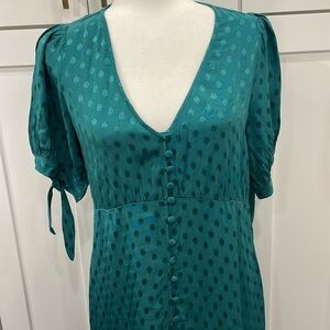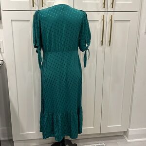 New with tags Maeve by Anthropologie Eudora dress in turquoise. V-neck, Button front, side slant pockets, tie sleeves, flounced hem, midi length. Size 8. New never worn condition, original tag still attached. Please see photos, measurements are for reference only. Reasonable offers welcome.