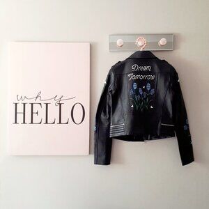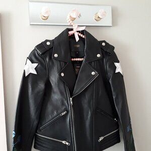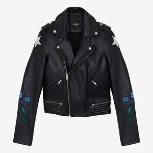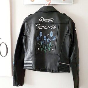 NWT Maje black leather patch embroidered “Dream Tomorrow” moto biker jacket