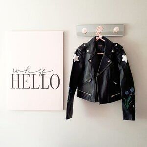 NWT Maje black leather patch embroidered “Dream Tomorrow” moto biker jacket, S