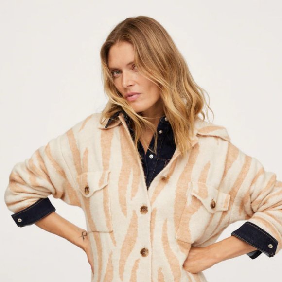 Beautiful zebra print cardigan by Mango. Size Medium. New with tags. Button up closure at front. Two front upper chest pockets. 79% Polyester / 14% Acrylic / 3% Elastene and 4% Wool. P2P 22.5" unstretched. Shacket is stretchy. RRP $99.99 + tax.