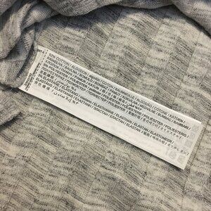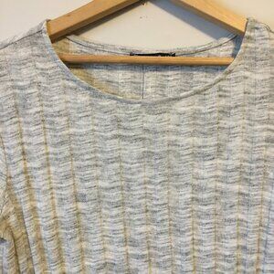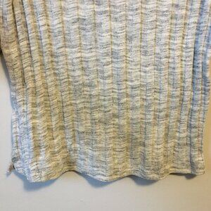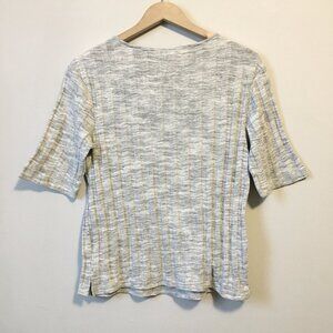 Very good unworn condition, ribbed, soft, comfortable, cotton blend, half sleeve shirt by Mango featuring a knit in white, grey and tiny amounts of black. A wardrobe essential.