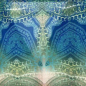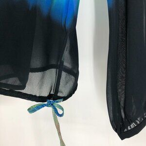 Long sleeve blouse by Marciano. Unique paisley and ombre style dye in sea-like colors of blue, green and black. It’s like it’s own art piece