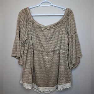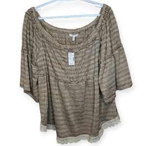NWT Maurice's Tan White Stiped Smocked Off the Shoulder Top Lace Women 1 Boho