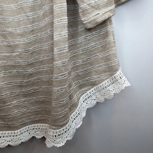 The beige/tan, and white striped pattern adds a touch of summer while the delicate lace detailing (along the bottom) + crocheting adds a touch of romance.