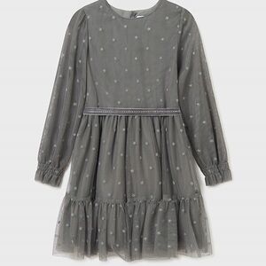 A charming cream beige dress for little girls by Mayoral, made in soft dotted tulle. It has gently puffed sleeves, elasticated cuffs, and a gorgeous tiered skirt with a ruffle hem. The waist is trimmed with tulle flower appliqués for a pretty finishing touch. Fully lined for comfort, the dress fastens neatly with a concealed zip on the back.