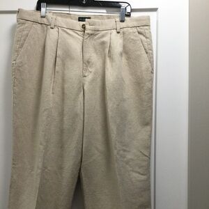 These are gorgeous brand new Dockers Irish Linen relaxed fit pants. In a lovely oatmeal colour, two side pockets and two back pockets. Pleated front, bottom cuffs. Look gorgeous with a casual top, or dress it up with a crewneck. Quality linen, comfortable relaxed fit. Wrinkle resistant and machine washable. Size 38” waist and 30 “leg.