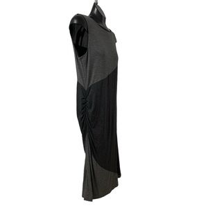 Mix of charcoal grey and light grey midi dress. Top and bottom of dress are striped. Side of the dress has a cinching for a tighter look.