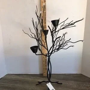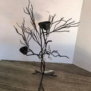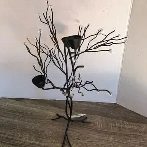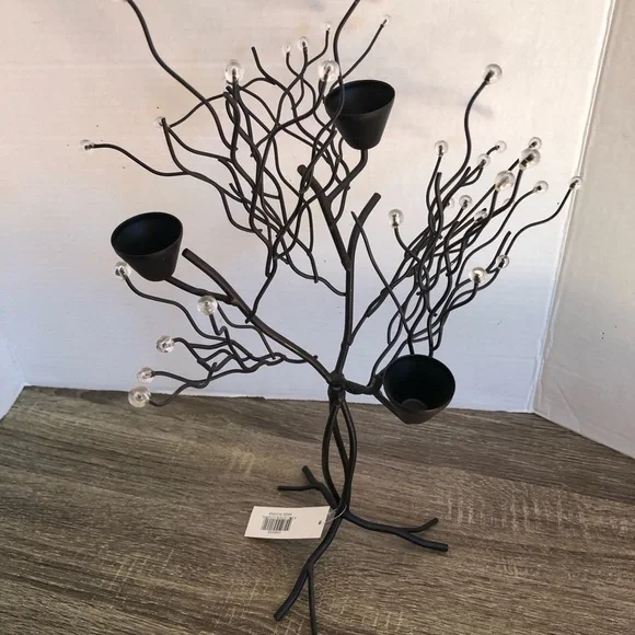 Black metal tree with clear beaded accents and spots for three candlesticks. Larger spots for the candles so you may need those little adjustable sizer rings.