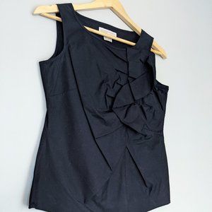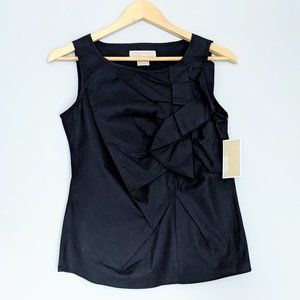 New with tags MICHAEL Michael Kors sleeveless top. Black. Ruching / ruffle detail on bust. Looks amazing tucked into a pencil skirt! Size 2. Originally $135. This top attracts pet hair like crazy, so it's not practical for me since we have cats. I've lint rollered it over 10 times, but to no avail - be aware that there will be cat hairs that remain. Also, my phone is incapable of photographing black colours, so the pics don't do it justice.