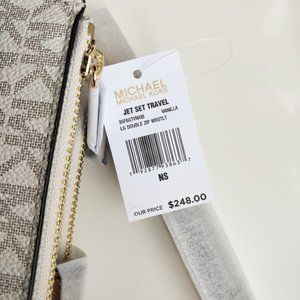 A NWT authentic Michael Kors large double zip wristlet in vanilla. Perfect brand new condition with foam wrappings. Comes in a plastic bag (removed for photographs) with the original shopping bag. Measures 7.3 x 4.5 x 1.2 in. Retails $248+tax = $279.