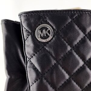 New with tags, Michael Kors women's winter gloves in a supple black quilted leather, soft fleece lining and signature silver MK logo on the cuff of the right glove, size medium.
