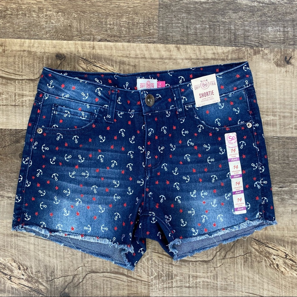SO NWT Mid Rise Shortie Size 14. Features super stretch, adjustable waist, five pocket style, zipper fly with button closure and belt loops. Frayed hem. Anchor and star printed. Measurements flat: