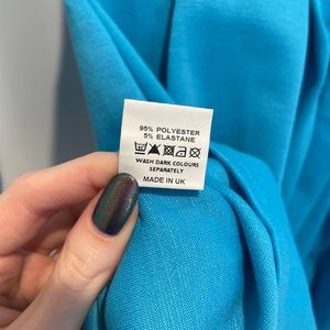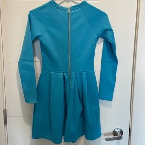 Style tags: bright blue turquoise teal fit and flare skater dress cold shoulder long sleeve a-line prom pleated circle skirt box pleats scuba neoprene y2k millennial