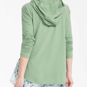 Moisture-wicking hoodie with long raglan sleeves, relaxed fit, and rounded high-low hem.