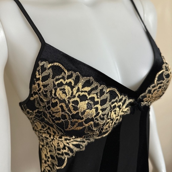 New with tags - Morgan Taylor intimates. Black with gold lace négligée / nighty. adjustable straps. velvet bi-fabric skirt.