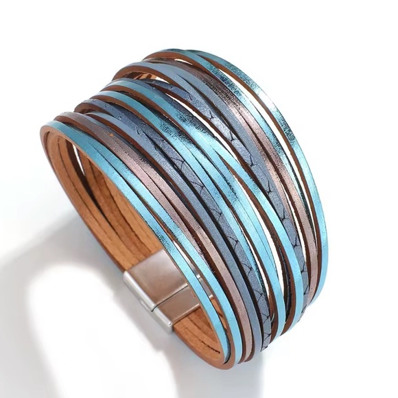This stylish NWT bracelet features a beautiful combination of brown and blue faux leather strips, giving it a trendy, layered look. The metallic blue accents bring a pop of color and modern edge, making it a perfect accessory for casual or dressy occasions. The magnetic clasp ensures a secure and comfortable fit.
