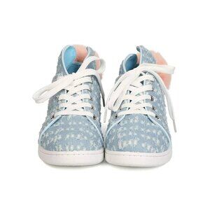 NWT / NIB Qupid blue denim-like bunny ear lace up faux fur pom pom sneakers