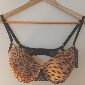 NWT Natori Bliss Perfection Leopard Print Lightly Lined Lace Trim Bra. Size 34DD. Nylon Spandex Blend.