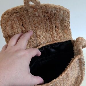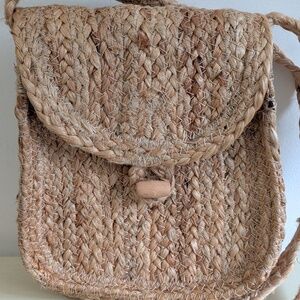 new w tags! Perfect for summer, this raffia straw purse can be worn as a shoulder bag or cross body bag. Flap with a wooden button closure. This purse has black fabric lining with one small side pocket. Strap drop is about 22". Bag measures about 8" x 9". Note: this is nade from natural woven materials so there are imperfections - please look at all photos. Original price was 24GBP which is about $40CAD (Next is an English retailer).