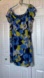 Lightweight Silk Dress in Botanical Floral Print of Chartreuse, Navy, White and Cornflower Blue. Fully lined with Side Zip. Scooped Neck in front and Back. Elasticized Shoulder and Flutter Short Sleeve. Pin Tucks in front and Sewn in Tab at waist in back.